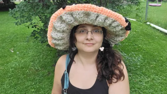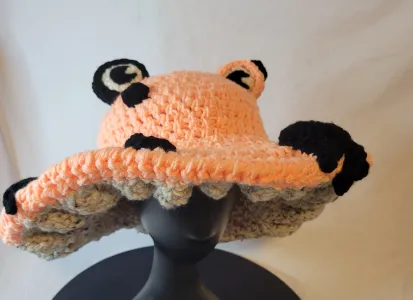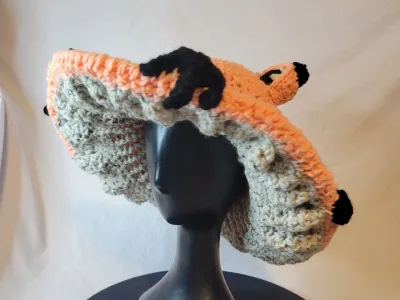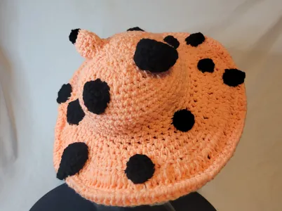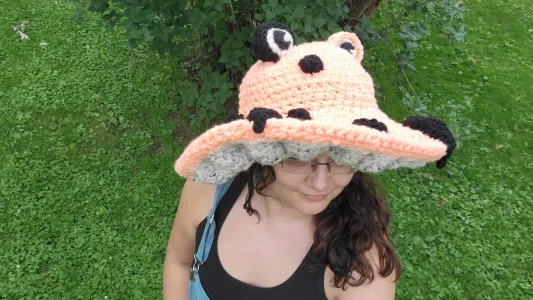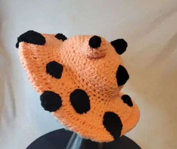 This peachy mushroom hat is so fun to wear! With cute needle felted eyes, it is like you are wearing a magical creature on your head. Great for any cosplay or larping event or just fun to wear!